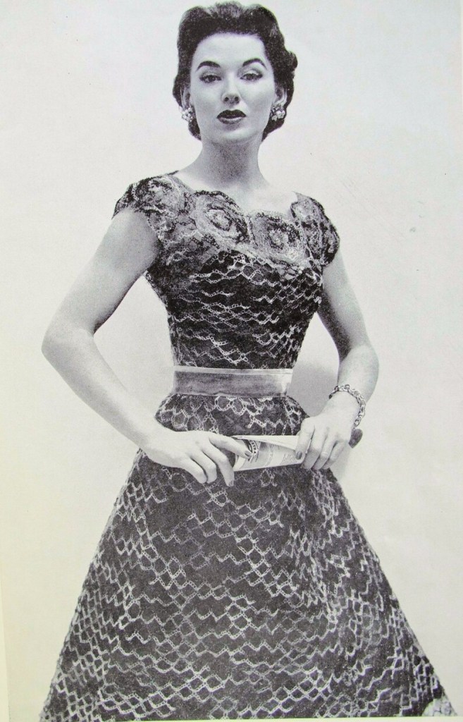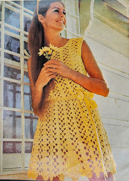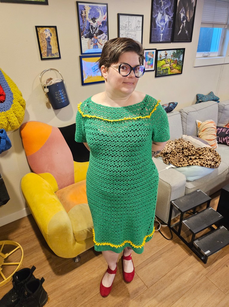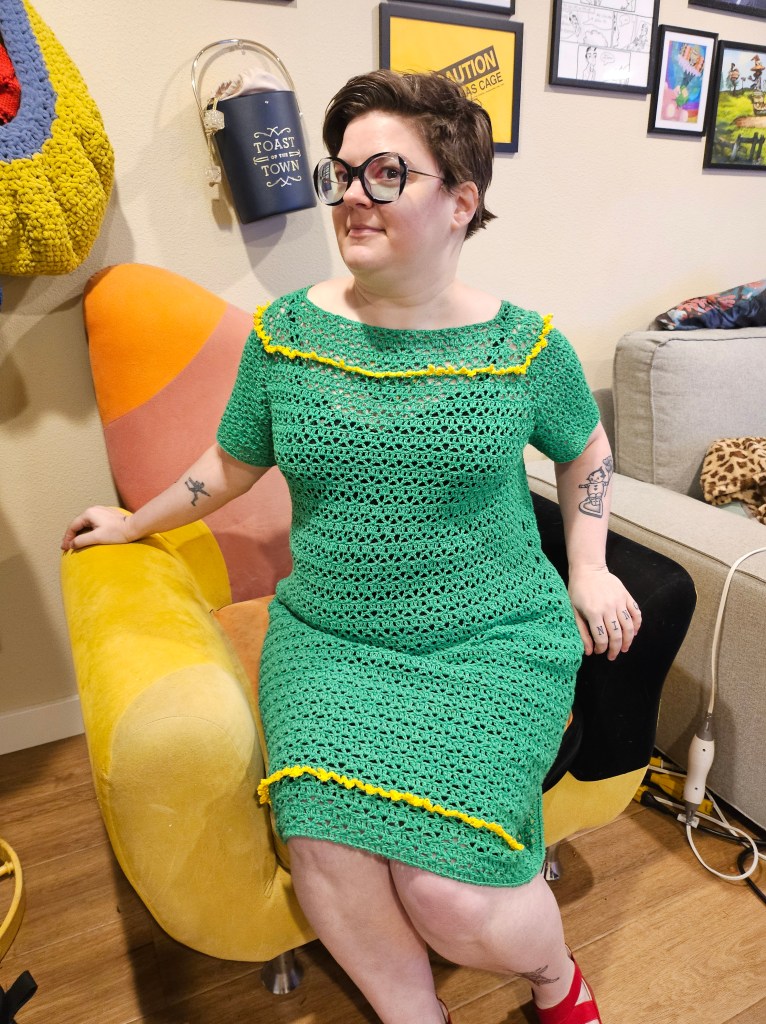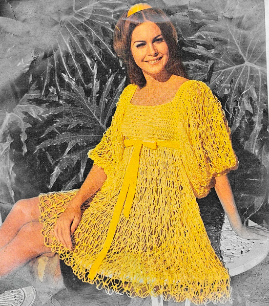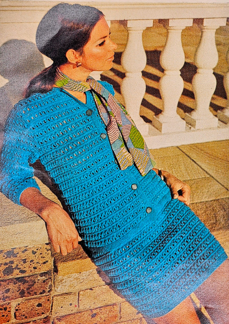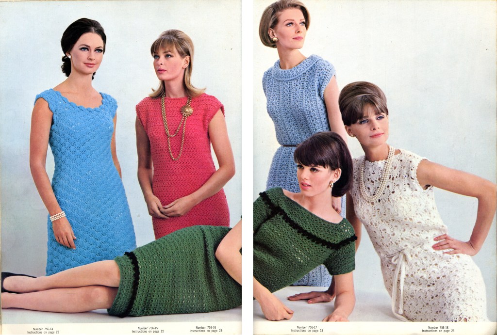 The green dress in the 18-20 size (the size I made), is designed to be 41″ around when sewn together. Size 18-20 in the 1960s meant any bust between 38-40 inches and hips between 40-42 inches. So, the top part of the dress fits me fine as designed. But the part around my hips needed to be increased by several inches to both get around my hips and also have the same ease as the rest of the garment. Using the provided gauge (9 DC = 2 inches), I created this increase and decrease so that I could create the needed hip space and then bring the dress back to the original measurements where they were needed.