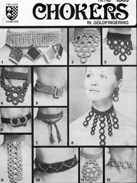 Courtesy of Twilley’s, a British yarn company, all of these chokers are built in similar fashion with the fun being in the different details. Some chokers call for curtain rings, which you can find at a sewing store on or Amazon. British crochet terms used, fingering weight yarn required.