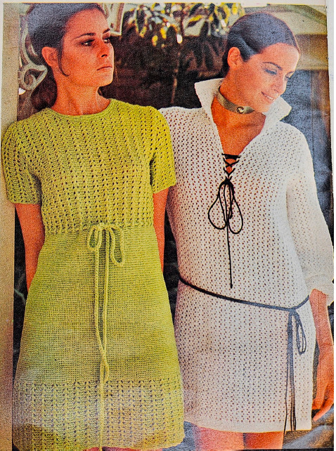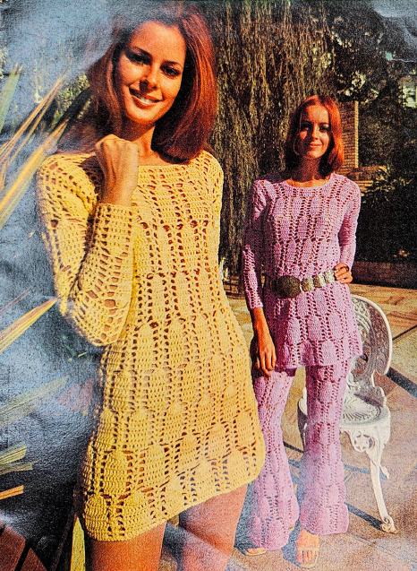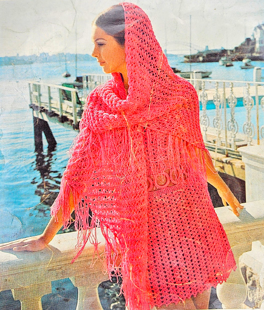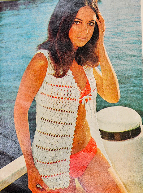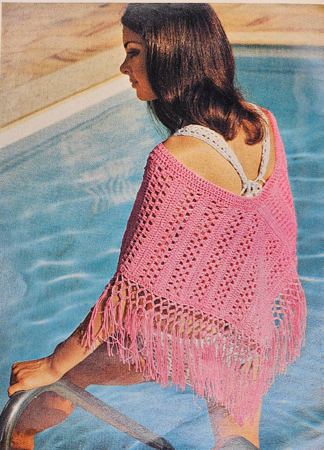 Anyway, this booklet includes 9 crochet patterns and 3 knitting patterns. Two of the crochet patterns are bikinis, and the photographer absolutely failed to get any full shots of them. The first one you can mostly see. The second one you can only see the straps under the poncho.