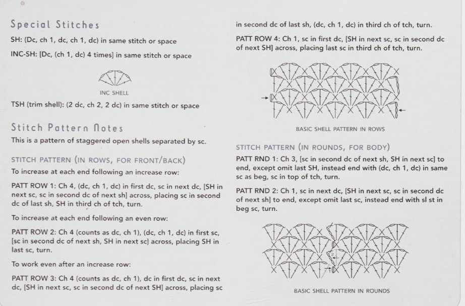 There was the Stitch Pattern (In Rows, For Front/Back) and the Stitch Pattern (In Rounds, For Body). Now, I knew I was working the front and back, so I realized I was supposed to work those pattern rows, but then I got a little more confused by the comment above the Pattern Row 2: “To increase at each end following an even row.” I was confused because there was nothing in the written out instructions about increases, and so I was worried that I was missing some important note about how to increase.