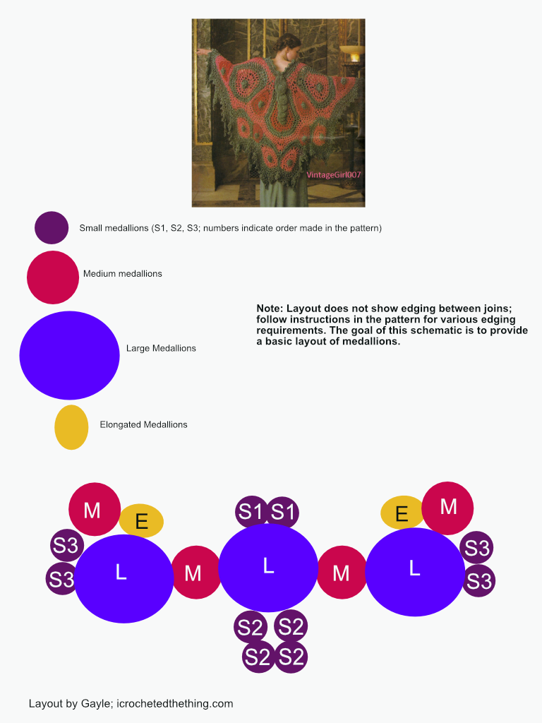 The instructions for this shawl are not great. Not only is there errata (on the vintage errata page), but there is also no diagram to help you figure out what the pattern means when it says attach things to the front or back. So, I made a very, very simple diagram to help in the joining process. May you have less headaches than I did.