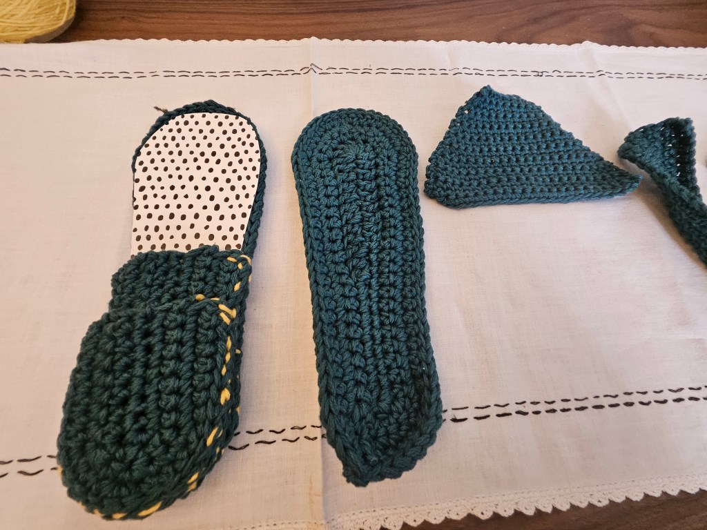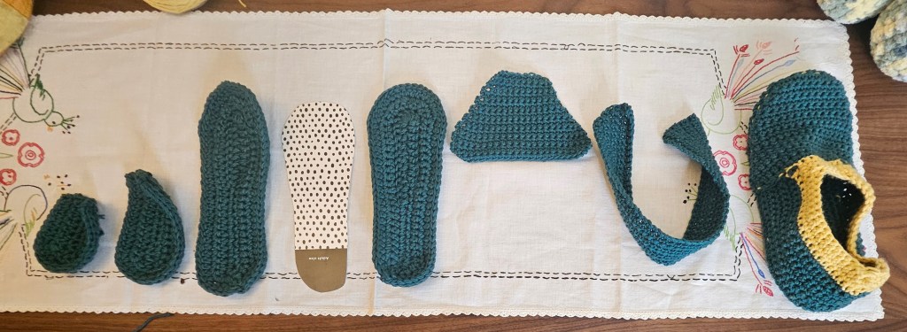 From left to right: Top Heel Piece, Bottom Heel Piece, Bottom Sole, Cardboard Insole, Top Sole, Upper – Instep, Back Piece, Finished Slipper