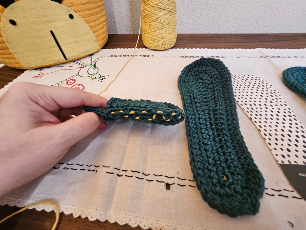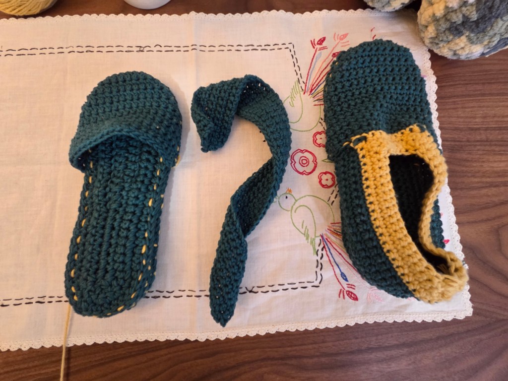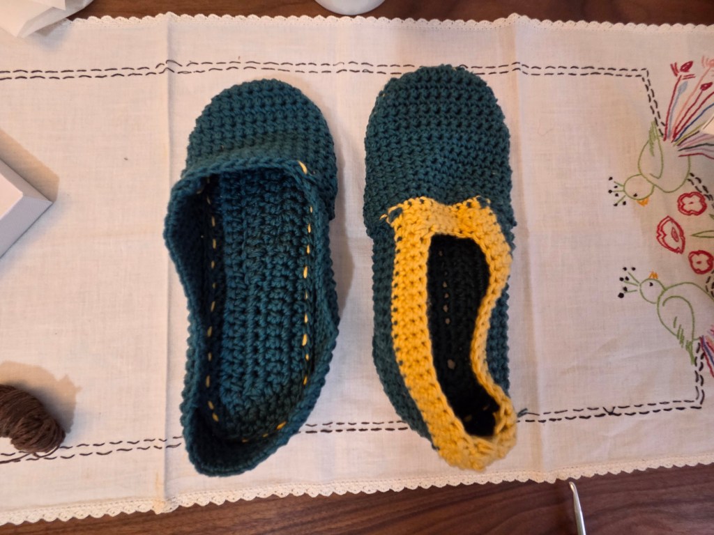 As mentioned above, the trim was something I did on my own to make the slipper fit a bit better. If you need it as well, go down a full millimeter in hook size and work four rows of single crochet, working decreases at the upper corners. Try on as you go to get the fit you want.