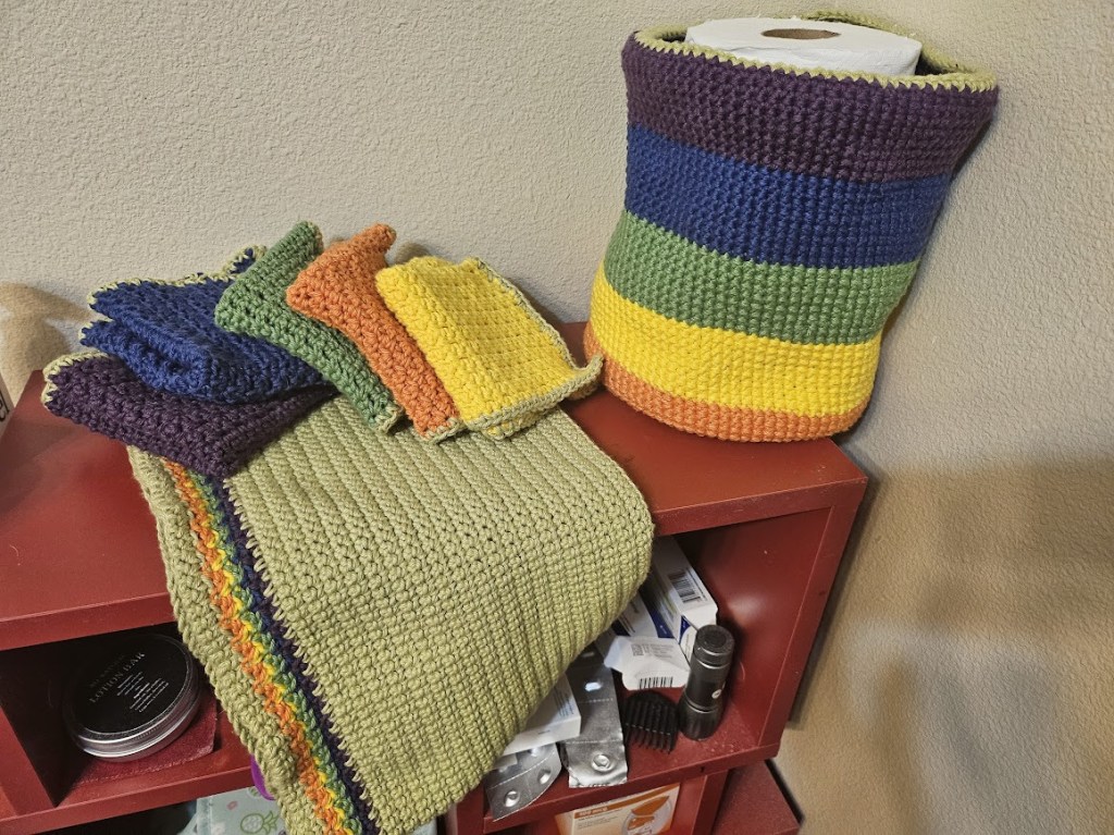 Order of operations to guarantee you have enough yarn for all parts is as follows: Complete first 7 rows of towel, then complete washclothes, then complete the basket, then finish towel. The instructions are written with this in mind.