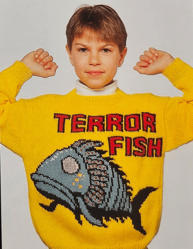 Now, yes, I only crochet and this is knit (intarsia knit, specifically), but I love a challenge, so I dug around for awhile. This amazing sweater was a design done by Gary Kennedy, a prolific designer in the 1980s and into the 1990s. He specialized in intarsia, and this design came from a booklet for a BBC show called Stingray. It was a puppet show by the same people who did Thunderbirds, and the Terror Fish was clearly a recurring character.